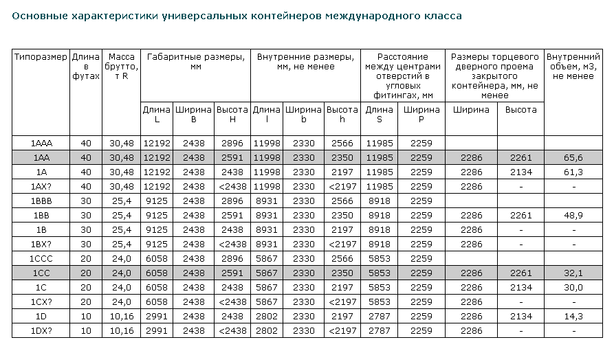 Основные характеристики универсальных контейнеров международного класса